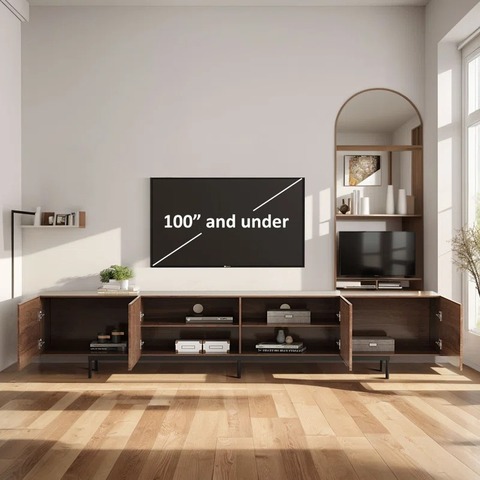 OEMモダンクルミMDF TVキャビネットルーバードア付きTVスタンド金属ベースケーブル管理システム耐久性