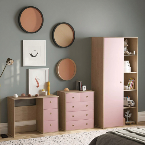 Vendita calda di nuovo Design rosa quercia 3 pezzo camera da letto Set di mobili con cassettiera scrivania ampio deposito per Hotel appartamento